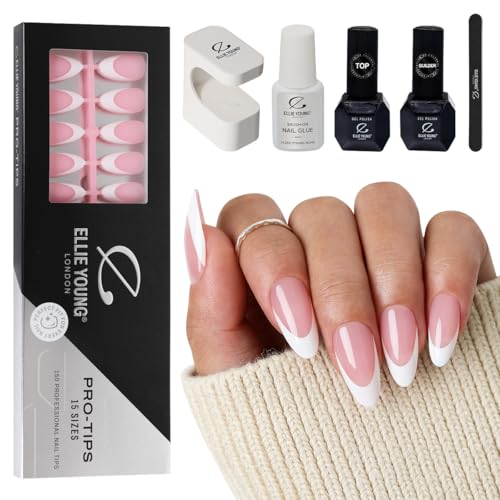 Ellie Young French Kit 150pcs French Nail Tip, Press-On Nails – 15 Sizes, Gel Acrylic Nail Extensions for DIY Nail Art & Polish (ONLY NAILS) Pink Brown Medium Almond ((SET) Pink Medium Almond)