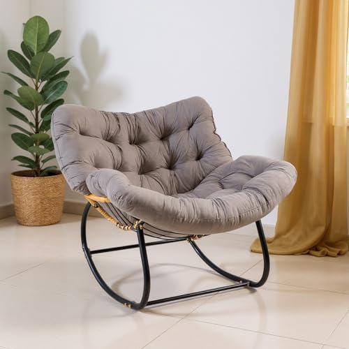 Egg Chairs Oversized Rattan Wicker Outdoor Rocking Chair Metal Frame Garden Rocking Chair Large Support Modern with Cushioned Seat (Light Grey)