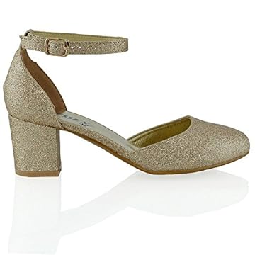 ESSEX GLAM Womens Low Mid Block Heel Ankle Strap Buckle Ladies Sandals Court Sho...