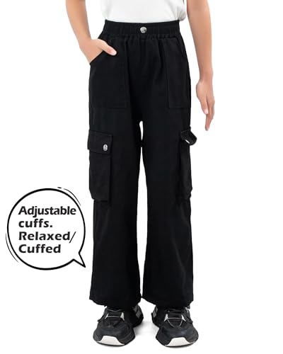 KAKU NANU Girls Cargo Trousers Wide Leg Joggers Black Elastic Waist Cotton Baggy...