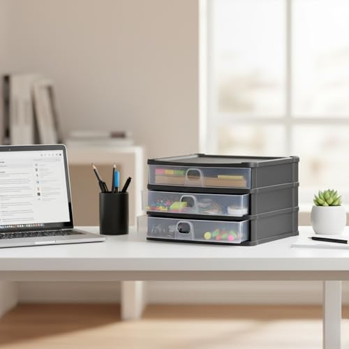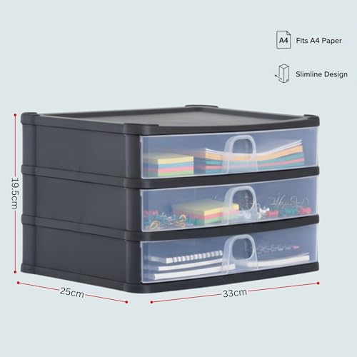 AOC24 Plastic A4 Drawer Unit β Medium 3 Shallow Drawers, Slimline Desktop Stor...