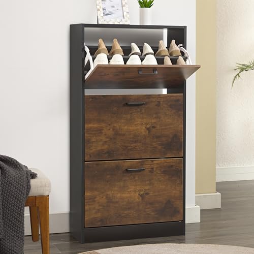 3 Drawer Shoe Storage Cabinet Pull Down Shoe Cabinet with 3 Tier Shoe Rack Woode...
