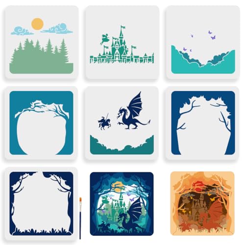 MAYJOYDIY 7pcs Layered Dragon Fairy Tale Stencil 30×30cm Large Dragon Castle St...