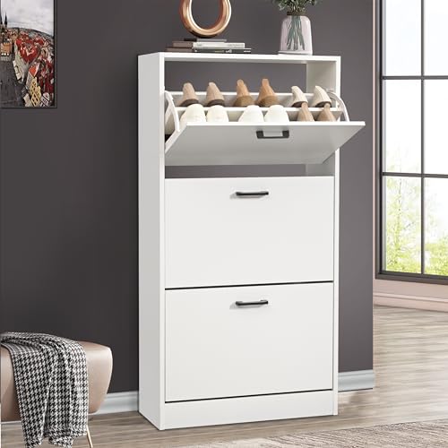 Shoe Cabinet with 3 Drawers, Pull Down Wooden Shoe Storage Organizer Cupboard Sh...