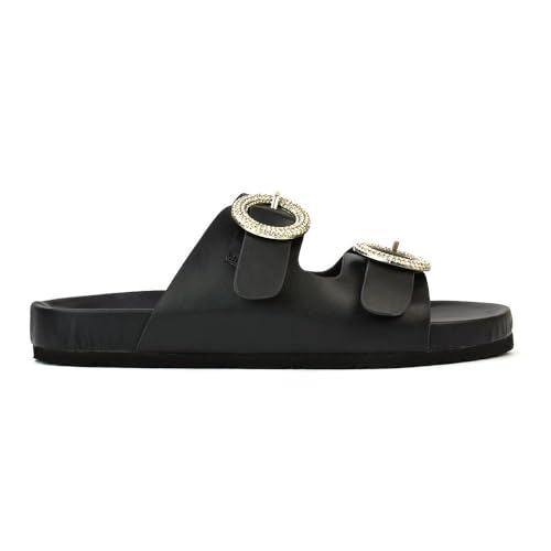 Womens Flat Slip On Slider Ladies Diamante Double Buckle Straps Casual Black San...